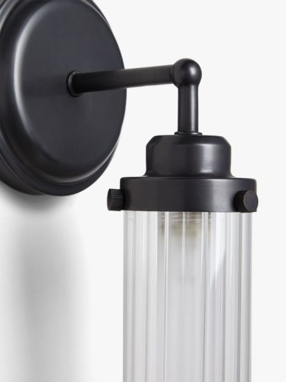 We've designed this restorative wall light from layered glass in a ribbed finish and dark metal. Offering a soft glow of light in your space, and IP44 rated for suitability in bathrooms, it's single-arm design is compact and easy to style in both contemporary and more industrial-inspired interiors.